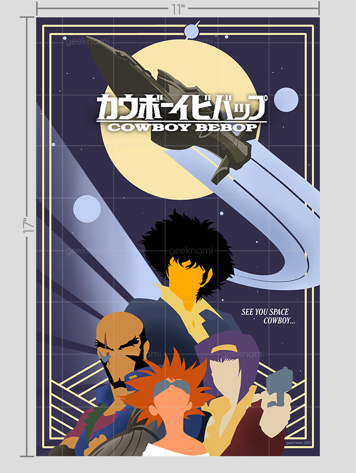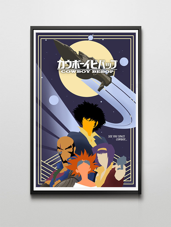 An art deco tribute to the masterpiece, Cowboy Bebop. See you, space cowboy.
